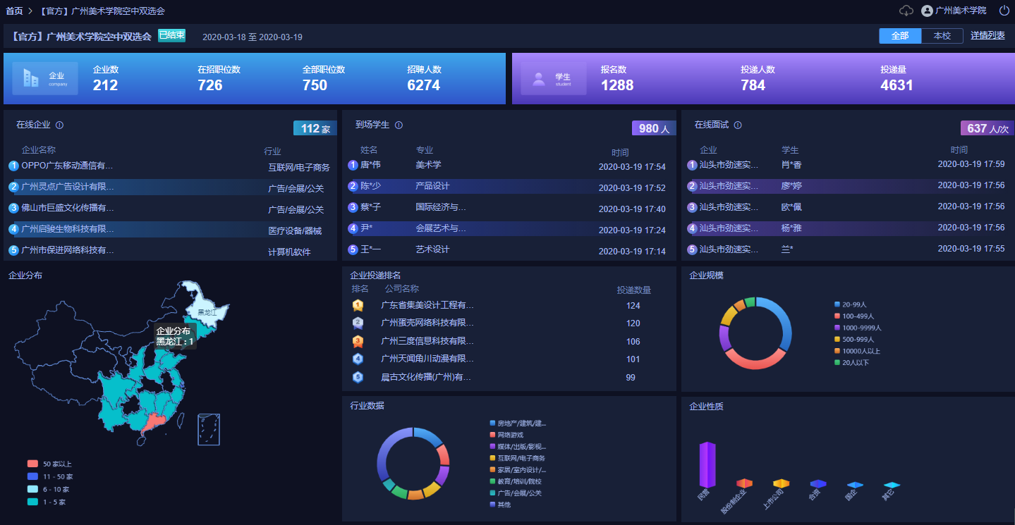 3月18日至19日,为期两天的乐竞在线注册(中国)有限公司2020届毕业生春季校园网络招聘会成功上线。此次招聘会共有212家企事业单位报名参会,提供职位数750个,提供岗位数6274个;报名参会的校内外毕业生1288人,总投递简历数高达4631份。参会单位多为美术设计类企事业单位,其中包括广东省广轻控股集团有限公司、广州三七互娱科技有限公司、广州凡拓数字创意科技股份有限公司等业内知名企业,分布地域遍及长三角、珠三角等地,职位需求集中在动漫设计、服装设计、工业设计、产品设计、室内设计、平面设计、视觉传达、环境艺术设计、美术教育培训等专业方向。与往年同期相比,由于没有场地限制,参会单位的数量有较大提升,职位需求也更为丰富,雕塑专业和美术教育专业需求有所增加。此次线上招聘,包括面试环节在内的全过程均在线上完成,受到了毕业生和用人单位的高度认可和一致好评。