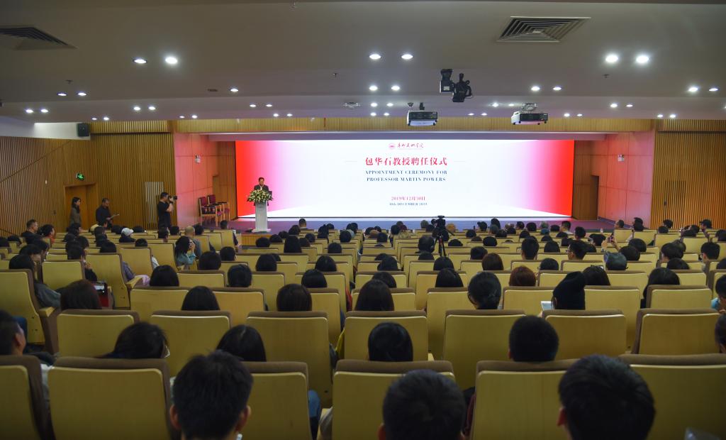 12月30日下午,我校在昌岗校区国际学术报告厅举行包华石(Martin J. Powers)名誉教授聘任仪式。学校党委书记谢昌晶、院长李劲堃,党委副书记黄启明、穆林,副院长范勃、蔡拥华,图像与历史高等研究院院长、艺术与人文学院院长尹吉男,以及相关职能部门、二级学院负责人及各院系师生代表300余人出席了聘任仪式。谢昌晶为包华石颁发名誉教授聘书,仪式由范勃主持。