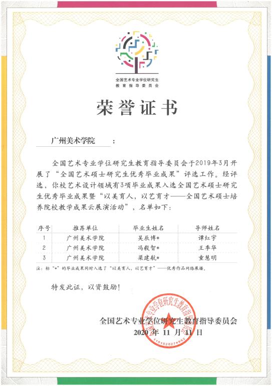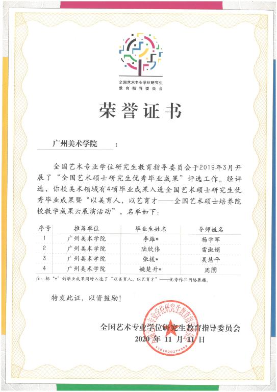 近日,全国艺术专业学位研究生教育指导委员会向我校颁发全国艺术硕士研究生优秀毕业成果暨“以美育人,以艺育才——全国艺术硕士培养院校教学成果云展演活动”的荣誉证书,我校共7项毕业成果入选,其中4项为美术领域作品,3项为艺术设计领域作品。