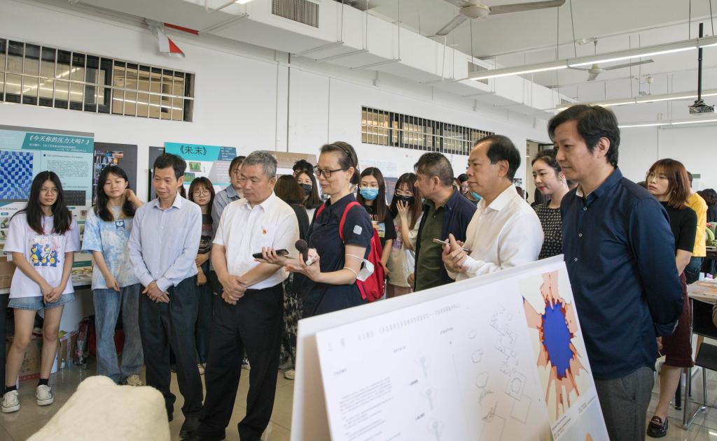 在4月21日当天的毕业创作中期汇看中,谢昌晶、李劲堃要求师生们在毕业创作中要认真贯彻落实习近平总书记考察清华大学时的重要讲话精神,注重艺术与科技相融合,关注现实,服务社会,努力实现把美术成果更好服务人民群众的高品质生活需求。