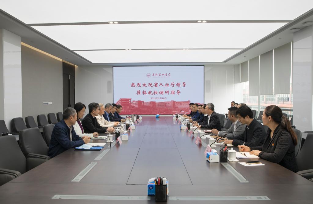 3月10日下午,广东省人力资源和社会保障厅党组书记、厅长陈奕威,副厅长周成以及办公室、人力资源市场处、人才开发处、事业单位人事管理处、工资福利处等部门负责人一行到我校大学城校区调研指导,对深化事业单位改革试点、加强人才队伍建设等工作广泛征求意见。学校党委书记谢昌晶,院长李劲堃,副院长范勃,党政办、人事处负责人以及相关工作人员参加调研会议。
