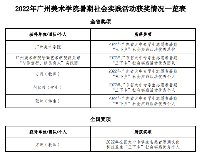 近期,团中央、团广东省委对2022年全国大中专学生暑期社会实践“三下乡”活动表现突出的优秀单位、优秀团队和优秀个人进行通报表彰。我校荣获2022年广东省大中专学生志愿者暑期“三下乡”社会实践活动优秀单位荣誉称号,绘画艺术学院韶关市“与你童行 以美育人”实践团获全省优秀团队荣誉称号,建筑艺术设计学院团总支书记方茂老师获全国、全省优秀个人荣誉称号,美术教育学院何家兴同学、工业设计学院张炜同学获全省优秀个人荣誉称号。