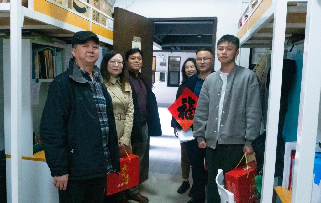 1月25日上午,适逢传统节日“小年”,学校党委书记谢昌晶、党委副书记黄启明、副院长李金水,以及党政办公室、学生工作部、后勤管理处、校团委、各二级学院相关负责人和辅导员深入大学城学生宿舍看望慰问寒假留校本科学生,并发放节日红包和春节礼品。