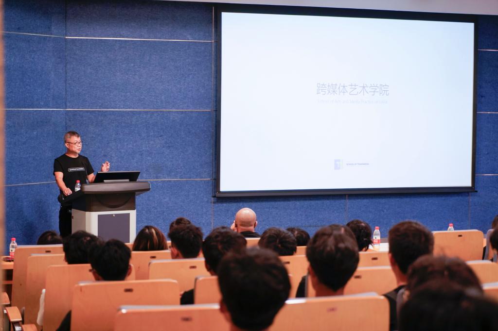跨媒体艺术学院院长冯峰以“跨媒体、跨未来”为题,首先为新生们介绍在新时代大背景下,紧跟国家发展步伐成立跨媒体艺术学院的背景、专业组成、师资结构和跨院超级工作室等基本情况。之后,他结合习近平总书记在清华美院考察时指出“美术、艺术、科学、技术相辅相成、相互促进、相得益彰”精神,希望同学们要自觉融入时代,树立大视野,打破专业局限,积极连接社会,在第二课堂或教学实习基地中不断历练成长。最后,冯峰和同学们分享了他的学习心得。